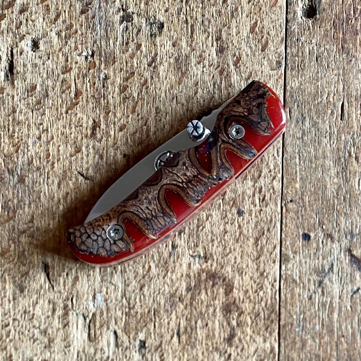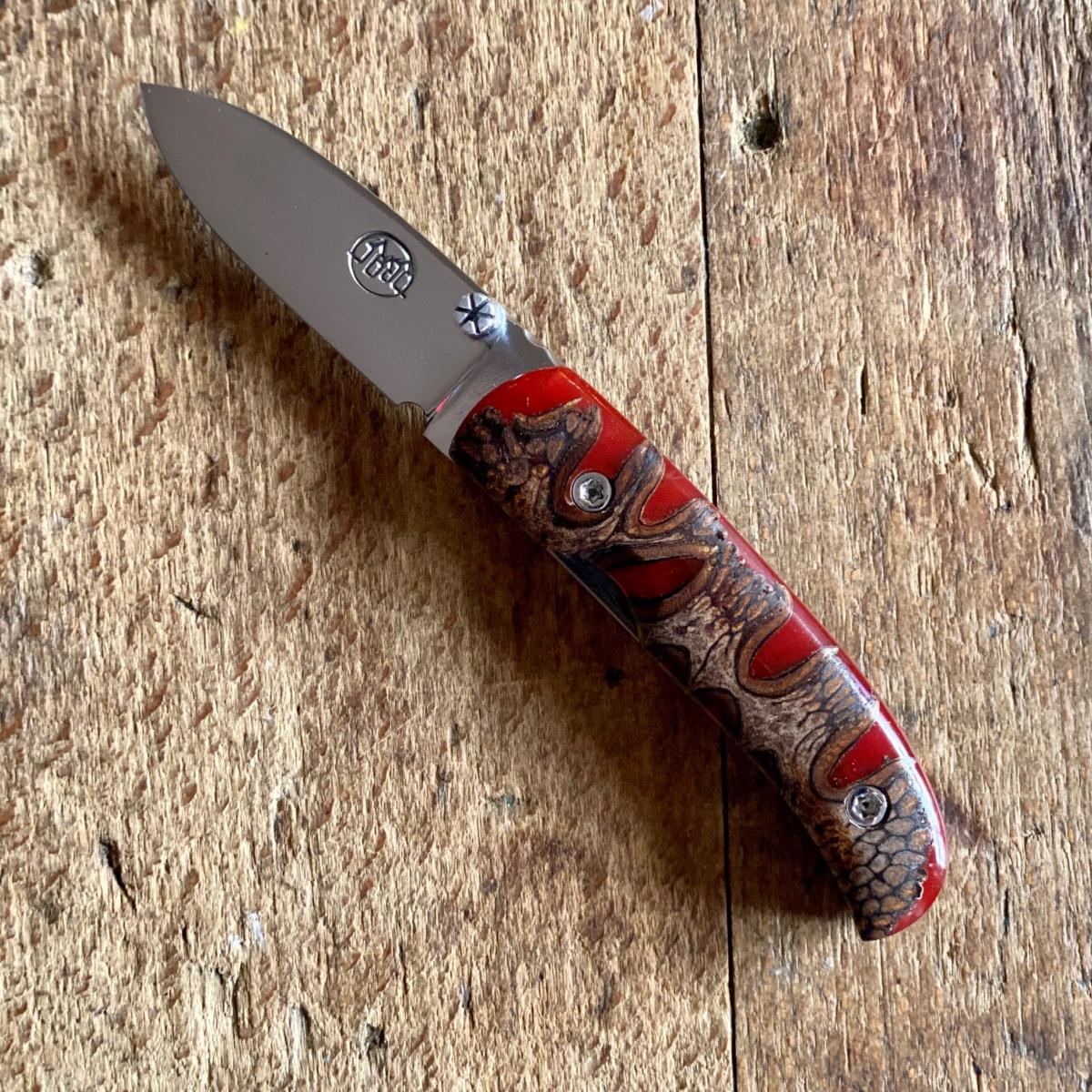 Faite et polie à la main, drop point, dos partiellement guilloché, trempe intégrale